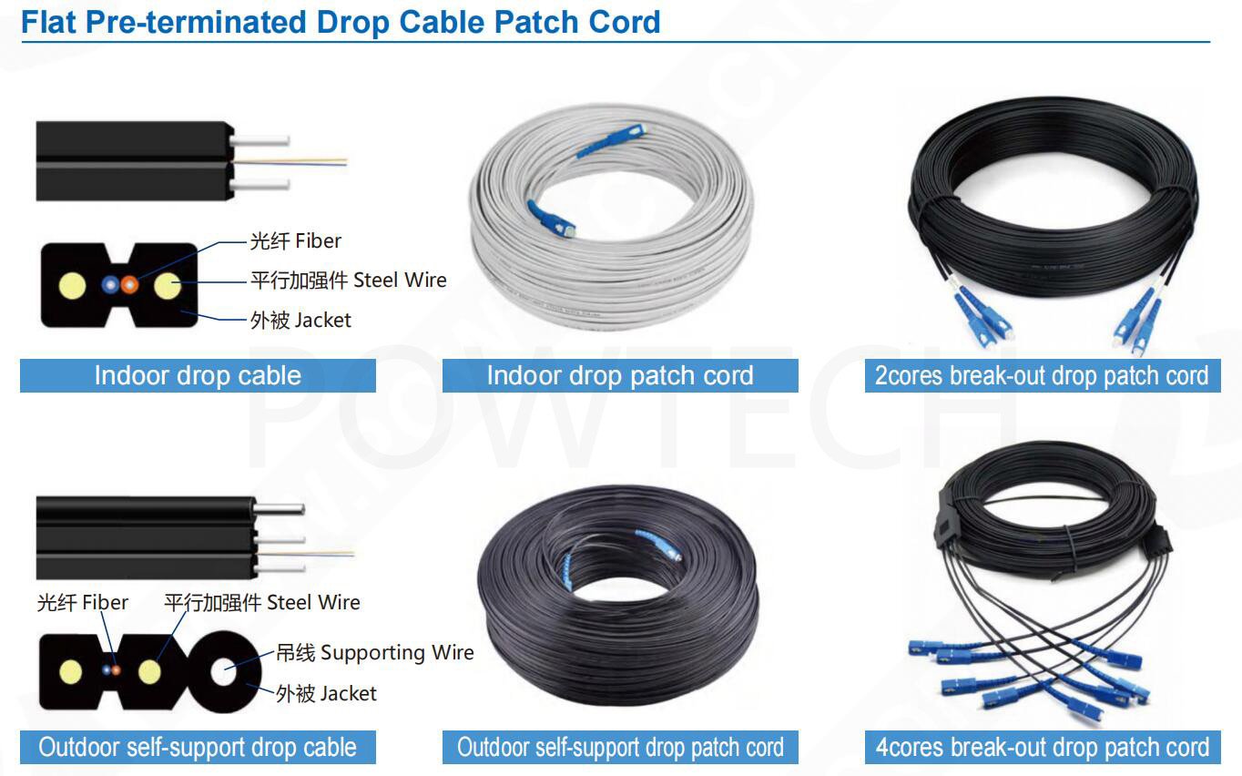 The FTTH Flat drop cable pre-terminated fiber optic patchcord is to terminate fiber connectors at both ends of the ready-made drop cable, which can have various interfaces such as LC and SC. At present, SC,LC interfaces are the majority in the market, and other FC and ST are also produced. Drop cable fiber jumpers are also known as FTTH butterfly pigtails and FTTH prefabricated drop cable jumpers.